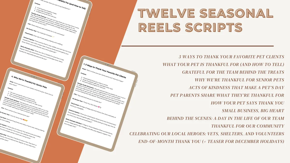 Twelve core Reel scripts are provided, with additional variations to make them adaptable for different pet professionals (vets, trainers, daycares) or for different tones (kid-friendly, costume fail, photo tips).