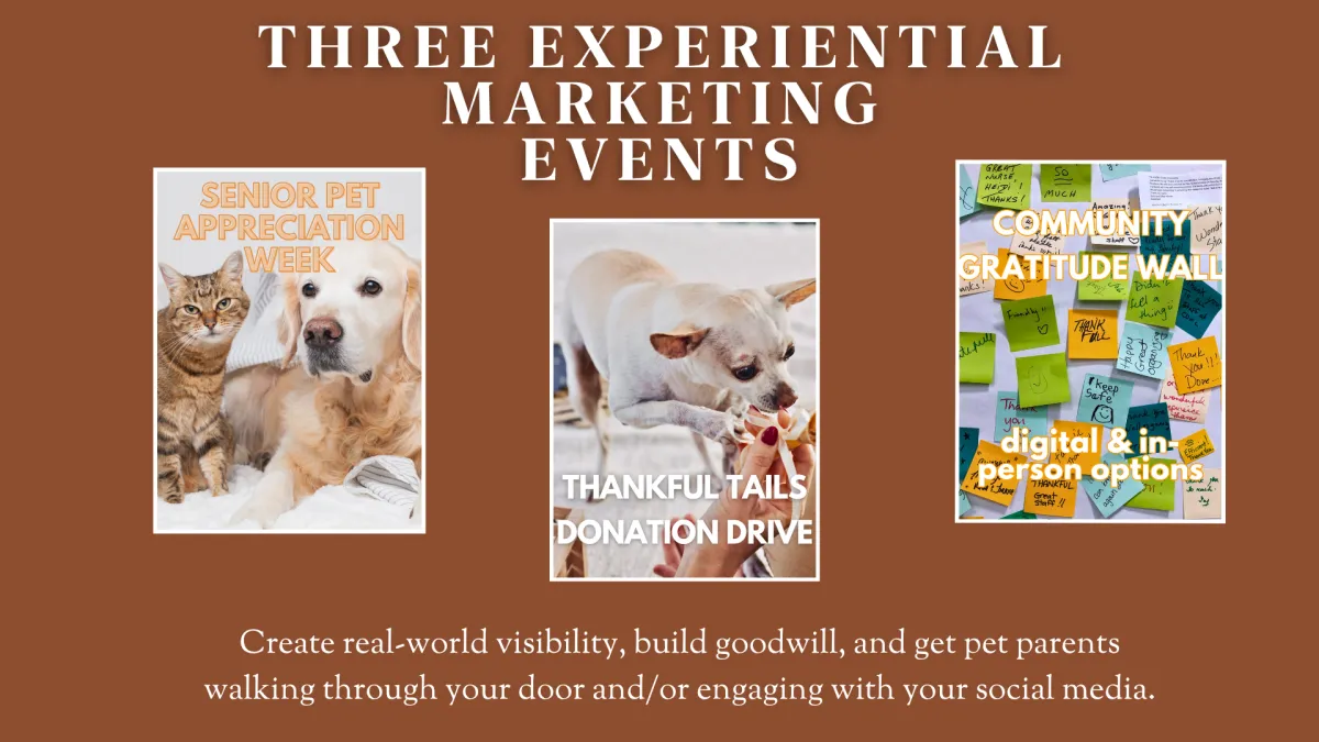 Experiential Marketing Projects Create real-world visibility, build goodwill, and get pet parents walking through your door and/or engaging with your social media.