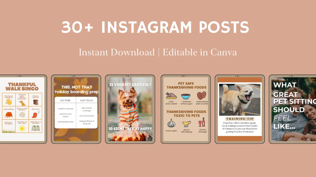 Over 30 Canva templates, with captions, to promote Gratitude & Giving Back as well as November holidays and seasonal pet content and with a recommended caption to pair with each.