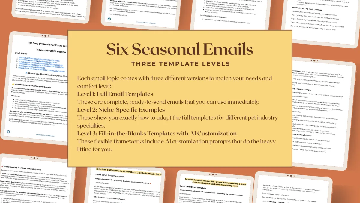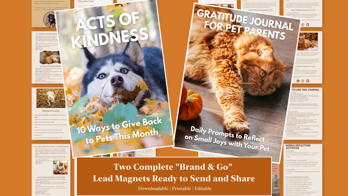 Gratitude Journal for Pet Parents: A beautifully designed printable featuring daily prompts that encourage pet parents to reflect on the small, meaningful moments with their pets. Perfect for email capture, client appreciation gifts, or social media downloads—this resource builds emotional connection while positioning your brand as a wellness-focused partner.